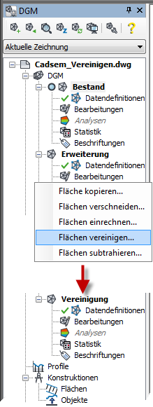 Mit diesem Befehl kann eine Fläche mit einer anderen Fläche oder einer Ebene vorgegebener Höhe zu einer neuen DGM-Fläche vereinigt werden. Innerhalb einer möglichen Schnittmenge erfolgen hierbei weitere Anweisungen für die Behandlung der Punkte und der dritten Dimension (Z-Werte). In der Praxis ist dieser Befehl sehr nützlich, wenn zwei Flächen, die z. B. aus unterschiedlichen Aufnahmen stammen (Fortführung eines Punktaufmasses), nachträglich zusammengeführt werden sollen. Durch die integrierte Regelung von Überlappungsbereichen kann das Ergebnis im Voraus den Erfordernissen entsprechend angepasst werden. |