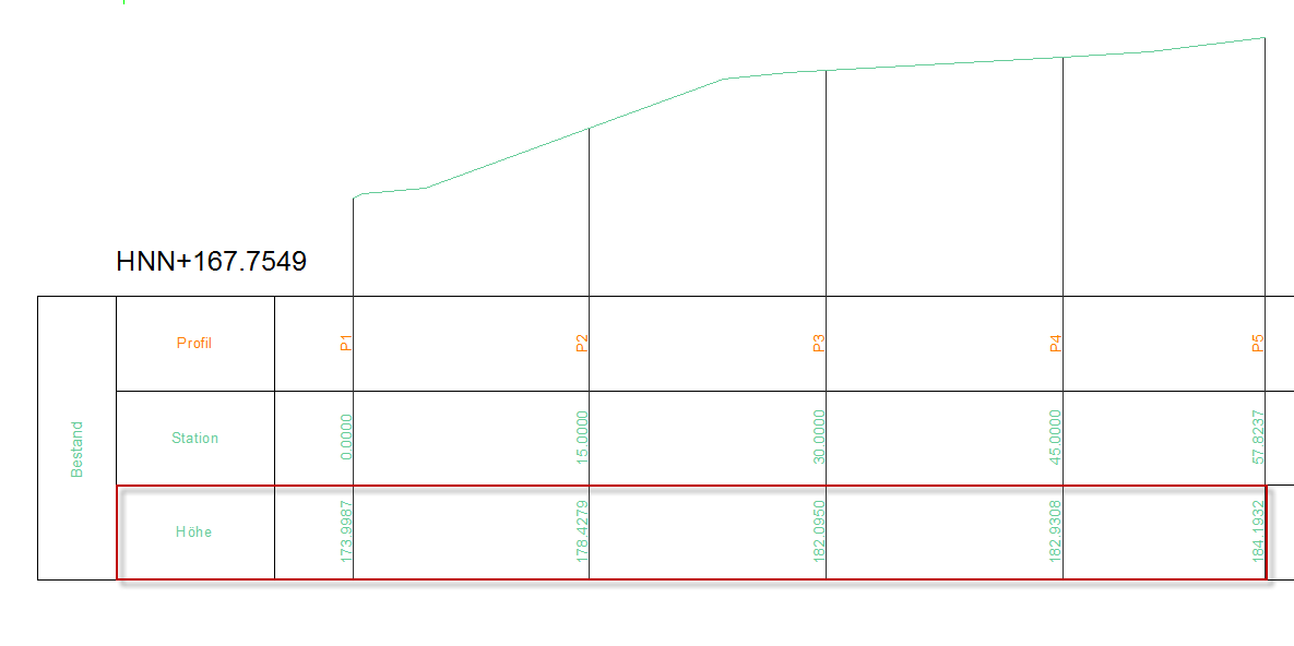 - Abstand von vorheriger Tabellenzeile – Abstandswert in Zeichnungseinheiten, welcher über die Tabellenzeile Geländehöhe gesetzt wird.
