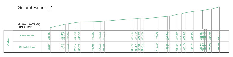 Ein Geländeschnitt ist ein vertikaler Schnitt durch die Geländeoberfläche entlang einer Schnittachse. Der Geländeschnitt ordnet sich der Schnittachse unter. Alle Änderungen der Schnittachse werden somit automatisch den gezeichneten Geländeschnitten zur Verfügung gestellt und ggf. automatisch aktualisiert. Beim Geländeschnitt werden die Stützpunkte der Schnittachse sowie die Schnittpunkte der Dreiecksseiten beschriftet. Zusätzlich können Geländehöhen und deren Stationen in einem gewählten Intervall entlang der Schnittachse im Profil beschriftet werden.