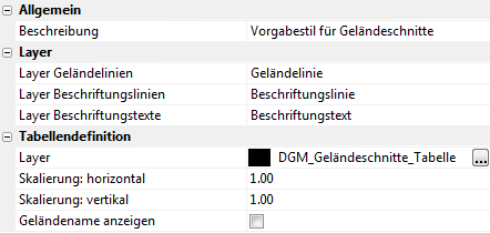 Die Tabellendefinition enthält Optionen für Vorgabewerte der Skalierung. Bei einem Geländeschnitt können grundsätzlich nur die Geländehöhen und die jeweiligen Geländestationen der Höhenpunkte automatisch in eine jeweilige Tabellenzeile eingetragen werden. Die Ausgabe der Oberflächenbezeichnung im Bereich der Tabellenzeilen ist ebenfalls optional möglich.