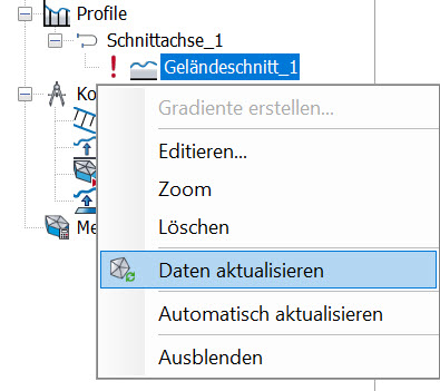 Bei deaktivierter Option werden Änderungen der Bezugselemente des jeweiligen Geländeschnitts durch ein rotes Ausrufungszeichen (!) signalisiert. Über das Kontextmenü am jeweiligen Geländeschnitt steht dabei die Option für die Aktualisierung zur Verfügung. Diese Funktion aktualisiert dann den ausgewählten und gezeichneten Schnitt. Sie können jederzeit über das Kontextmenü die automatische Aktualisierung wieder aktivieren, indem Sie den gleichnamigen Menüpunkt im Kontextmenü aktivieren. Mit dieser Option besteht jederzeit die Möglichkeit zwischen automatischem und manuellem Modus zu wechseln, ohne dabei immer den Dialog Geländeschnitt erstellen/editieren öffnen zu müssen. |