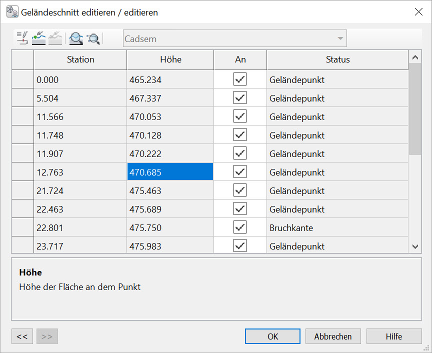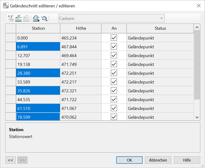 Im zweiten Teil des Dialogfelds können Sie die Beschriftungswerte anzeigen lassen und ggf. bearbeiten. Wählen Sie hierfür im unteren linken Dialogfeld die entsprechende Pfeilschaltfläche aus. Für jeden Beschriftungspunkt werden die Werte für die Station, die Höhe, der Anzeigestatus sowie der Punktstatus dargestellt. Die Stations- und Höhenwerte von Gelände- und Bruchkantenpunkten können nicht editiert werden. Diese Möglichkeit gibt es nur für manuell hinzugefügte Beschriftungspunkte in Bezug auf deren Stationswert. Die einzelnen Beschriftungspunkte lassen sich über die Auswahlschaltfläche der Spalte An innerhalb der Zeichnungsdarstellung aktivieren oder deaktivieren. |