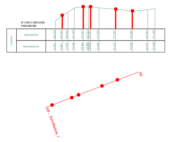 Jeder ausgewählte Punkt wird automatisch in der Zeichnung hervorgehoben, wenn dieser im Dialogfeld markiert oder ausgewählt wird. Dabei erfolgt die Hervorhebung sowohl entlang der Schnittachse, an der jeweiligen Station des Punktes sowie im gezeichneten Geländeschnitt. |