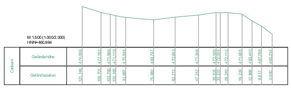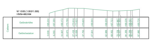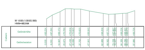 Für den Geländeschnitt ist die Darstellung in einer gewünschten horizontalen und vertikalen Skalierung möglich. Die Standardwerte der Skalierung betragen immer eine Zeichnungseinheit (1).