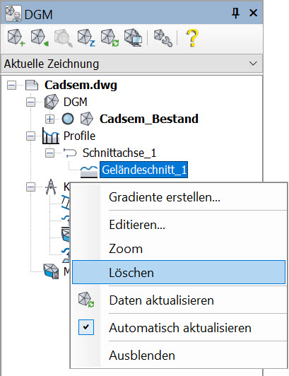 Das Löschen eines Geländeschnitts sollte immer durch Auswahl des betreffenden Elementes im Projektbrowser erfolgen. Die Funktion Löschen steht dabei nur im Kontextmenü zur Verfügung.