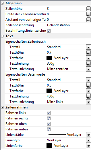 Für die Geländestationen können die Eigenschaften für den Textstil, Texthöhe, Textfarbe, Textdrehung und die Textausrichtung, getrennt für den Zeilenkopf und die Datenwerte, definiert werden. Die Tabellenzeile selbst kann mit einem Rahmen umgrenzt werden, wofür die Eigenschaften der Rahmenelemente als Optionen definierbar sind.