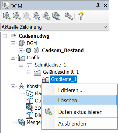 Das Löschen einer Gradiente sollte immer durch Auswahl des betreffenden Elementes im Projektbrowser erfolgen. Die Funktion Löschen steht dabei nur im Kontextmenü zur Verfügung.