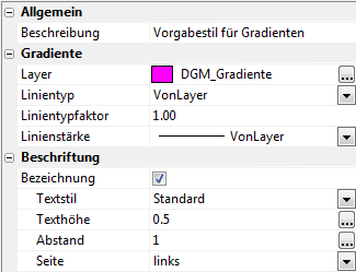 - Bezeichnung – Optionale Ausgabe der Gradientenbezeichnung innerhalb der Zeichnung mit der Vorgabe des gewünschten Textstils sowie der Texthöhe. Der anzuwendende Textstil muss dabei in der Zeichnung vorhanden sein. Zusätzlich können der Abstand des Textes in CAD-Einheiten sowie die Seite der Ausgabe festgelegt werden.