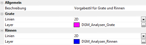 Die Ausgabe des Ergebnisses der Analyse erfolgt separat auf zwei Layern. Die endgültige Layerbezeichnung innerhalb der Zeichnung setzt sich dabei aus dem Oberflächennamen, dem Analysenamen sowie dem Vorgabelayer, getrennt durch ein $ Zeichen, zusammen.
