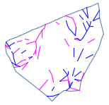 Diese Funktion erstellt Markierungen von Rinnen und Graten innerhalb des Geländemodells. Alle Grate (Wasserscheiden) werden nach Anfrage als rote, alle Rinnen (Gräben) als blaue Linien auf jeweils einem separaten Layer gezeichnet. Die Farben sowie die Layer sind in den Optionen des DGMs frei definierbar. Die Ausgabe der Linien kann zwischen 2D und 3D unterschieden werden. Das grafische Ergebnis der Zeichnung wird zusammengefasst als Block dargestellt. |