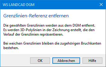 Vor dem Entfernen der Referenzen erscheint stets eine Sicherheitsabfrage, um versehentliches Entfernen zu verhindern und den Vorgang bzw. die Konsequenzen zu erläutern. Da bei der Entfernung der Referenz weicher Grenzlinien die Bruchkanten bestehen bleiben, verbleiben auch übernommene Punkte im TIN. |