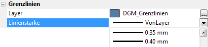 Für Grenzlinien, die im DGM mit 3D-Polylinien dargestellt werden, können der Layer sowie die Linienstärke festgelegt werden. Bitte achten Sie darauf, die Anzeige von Linienstärken im CAD-System zu aktivieren, falls diese am Bildschirm sichtbar sein sollen.