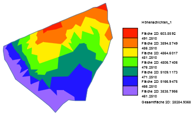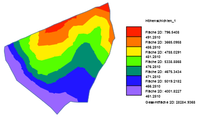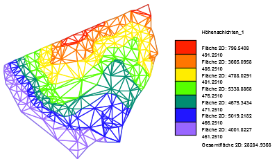 Mit der Höhenschichtenanalyse stellen Sie die Höhensituationen einzelner Bereiche der aktuellen Geländeoberfläche dar. Die Ausgabe der Ergebnisse kann durch einen Isolinienplan, farbige 3D-Flächen oder farbige 2D-Flächen erfolgen. Bei den 3D-Flächen wird zwischen einer einfachen und exakten Methode unterschieden. Für die exakte Methode werden die Höhenintervalle als Bruchkanten in die Oberfläche eingerechnet, um einen genauen Verlauf der Höhenbereiche zu erzielen. Dies ist bei der einfachen Methode nicht der Fall und daher wirkt das Ergebnis optisch meist etwas „ausgefranzt“, was damit zu begründen ist, dass einer 3D-Fläche nicht verschiedene Farben zugleich zugewiesen werden können.