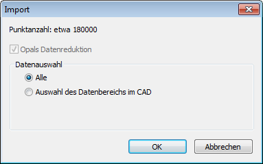 Nach Auswahl des Datenformats und der Eingabedatei über den Importdialog des DGMs wird nachfolgend ein weiterer Dialog zur Bestimmung des Datenumfangs geöffnet. In diesem Dialog erfolgt eine Abschätzung der Punktanzahl aus der gewählten Datei. Sie können zwischen der Option Alle Punkte oder der Auswahl des Datenbereichs im CAD unterscheiden. Bei der Festlegung eines polygonalen Bereichs im CAD wird der Dialog temporär geschlossen, um die Auswahl zu ermöglichen. |