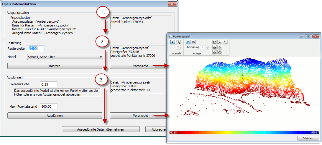 Alle Punkte innerhalb des gewählten Bereichs werden für die Weiterverarbeitung aus der Eingabedatei herausgefiltert. Die Punktdaten werden beim Import in den OPALS Data Manager überführt, wobei eine Datei mit der Erweiterung *.odm im Verzeichnis der Eingabedatei erstellt wird. Auf Basis dieser Daten erfolgt in zwei Schritten die Aufbereitung der Punktdaten. Im ersten Schritt werden die Daten gemäß der vorgegebenen Rasterweite gerastert und es wird dabei ein GeoTiff erstellt. Das Ergebnis dieses Vorgangs lässt sich in einem Datenviewer als Voransicht betrachten. Der Datenviewer bietet dabei zusätzlich Auswahlmöglichkeiten für einen spezifischen Datenbereich. Das Ausdünnen der Daten erfolgt unter Vorgabe einer Toleranzhöhe. Das vereinfachte Oberflächenmodell wird somit an keinem Punkt mehr als vom vorgegebenen Wert abweichen. Sinnvolle Werte liegen hier im Bereich von 0,2-0,5 m, je nach gewählter Methode bei der Erstellung der Ausgangsdaten.