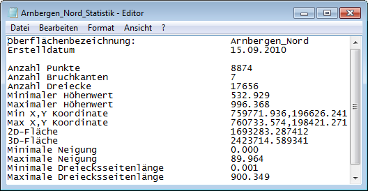 Die gesamte Statistik lässt sich bei Bedarf in eine frei wählbare Textdatei exportieren, wenn der Befehl in Datei exportieren aus dem Kontextmenü aufgerufen wird. Als Vorgabe des Dateinamens wird die Bezeichnung der DGM-Fläche mit dem Suffix _Statistik und der Dateiendung *.txt im Zeichnungsverzeichnis verwendet. |