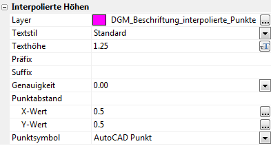 Die Beschriftung von interpolierten Höhen kann für die Ausgabe von Textinformationen an individuell gewählten Punkten, innerhalb des Geländemodells, verwendet werden. Für die Punktbeschriftungen können der Layer sowie der Textstil, die Texthöhe, die Genauigkeit sowie der Beschriftungsabstand vom jeweiligen Punkt festgelegt werden.
