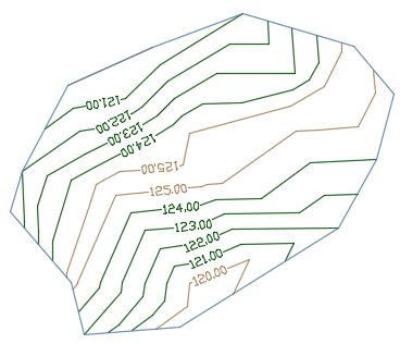 Der Isolinienplan kann mit dieser Funktion recht schnell und grafisch erstellt werden. Die Beschriftung von Isolinien richtet sich vorwiegend nach gestalterischen Gesichtspunkten. Sie werden aufgefordert, eine Bezugslinie an den zu beschriftenden Isolinien zu zeigen. Daraufhin wird die Isolinie am Schnittpunkt mit dieser Bezugslinie beschriftet und an der Textstelle aufgebrochen. Der Text wird mit dem aktuellen Beschriftungsstil erstellt und an der Linie ausgerichtet gezeichnet. Alternativ kann eine CAD-Linie oder Polylinie als Hilfselement dienen, um an den Kreuzungspunkten zwischen Hilfslinie und Isolinie jeweils automatisch den entsprechenden Beschriftungstext anzutragen. Die Beschriftungen werden automatisch auf einem DGM-Layer abgelegt, welcher sich aus der Oberflächenbezeichnung sowie dem gewählten Suffix aus dem Beschriftungsstil zusammensetzt. |