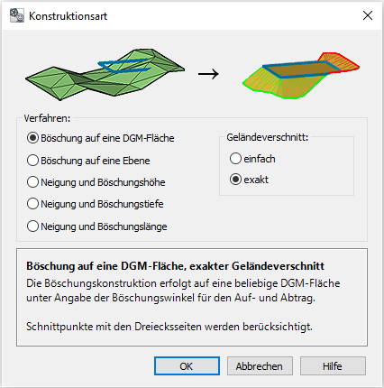 Die Festlegung der Konstruktionsart ist entscheidend für die weiteren Eingabemöglichkeiten und das Resultat der Böschungskonstruktion. Die Böschung auf eine DGM-Fläche ist hierbei die Vorgabe, weil es die häufigste Konstruktionsart darstellt. |