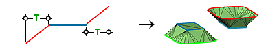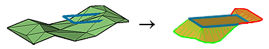 Beim einfachen Geländeschnitt werden nur die Schnittpunkte mit den Dreiecksflächen für die erzeugte Böschungskante berücksichtigt. Der exakte Geländeschnitt berücksichtigt zusätzlich die Schnittpunkte mit den Dreiecksseiten der DGM-Fläche. |