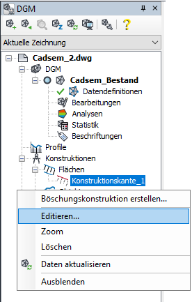 Hinweis: Verfügt die Konstruktionskante über eine oder mehrere Böschungskonstruktionen, stehen diese in einem assoziativen Verhältnis zur Konstruktionskante. Änderungen an einer Konstruktionskante führen zu einer Nachführung der Resultate von Böschungskonstruktionen. Dies gilt insbesondere auch für Editierungen mit CAD-Bordmitteln.