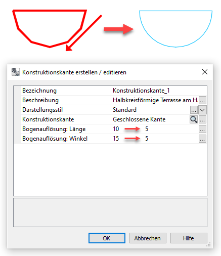 Das Editieren einer bestehenden Konstruktionskante erfolgt über die Auswahl des Elementes im Projektbrowser und den Aufruf des Befehls Editieren aus dem zugeordneten Kontextmenü. Die Konstruktionskante wird inklusive ihres Richtungssinns in der Zeichnung rot ausgeleuchtet und es erscheint die Dialogbox Konstruktionskante erstellen / editieren. Das Editieren bietet alle Möglichkeiten, die auch beim Erstellen einer neuen Konstruktionskante zur Verfügung stehen. Eine Änderung der Bogenparameter ist auch nachträglich möglich, solange die Konstruktionskante nicht mit CAD-Bordmitteln editiert wurde. Wurde eine Kante mit segmentierten Bögen z. B. inzwischen verschoben, können die Bogenparameter nicht mehr verändert werden und bleiben ausgegraut. Es ist aber möglich, eine neue Kante zu wählen.