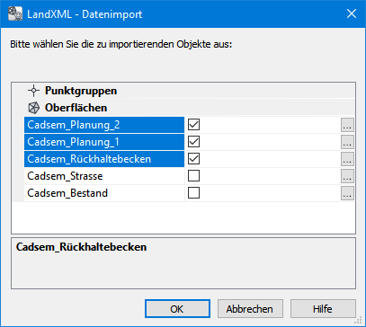 Nach Auswahl der Datei wird ein Dialogfeld angezeigt, worin die Inhalte bezüglich Punkt- und Oberflächendaten angezeigt werden. Beim Import von Oberflächen werden nur die entsprechenden Daten von vorhandenen DGM-Oberflächen innerhalb der XML-Datei ausgewertet.