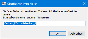 Wenn die Bezeichnung der zu importierenden Oberfläche bereits in der Zeichnung vorhanden ist, wird ein zusätzlicher Dialog eingeblendet, welcher zur Überprüfung der Bezeichnung auffordert. Hierbei wird die importierte Oberfläche als Vorschlag mit einem numerischen Suffix versehen, damit keine Namensgleichheit entsteht.