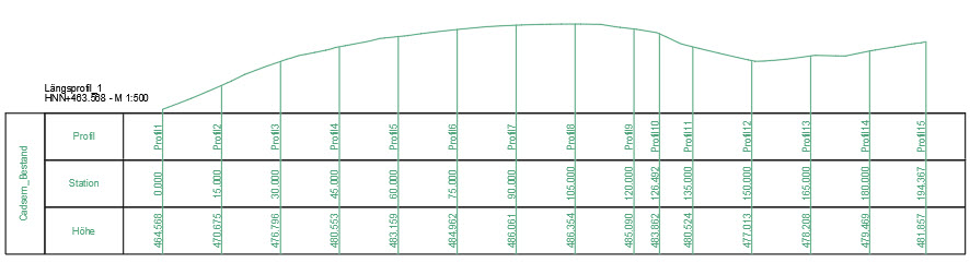 Ein Längsprofil ist ein vertikaler Geländeschnitt zur Visualisierung einer zuvor erstellten Schnittachse und einer Stationierung beschriftet werden. Das Längsprofil ordnet sich daher diesen beiden Objekten unter. Alle Änderungen der Schnittachse werden somit automatisch den gezeichneten Längsprofilen zur Verfügung gestellt und optional automatisch aktualisiert. Dieses Verhalten gilt ebenfalls bei Änderungen innerhalb der zugeordneten Stationierung. Beim Längsprofil werden nur die Stützpunkte der Profillinien der Stationierung beschriftet. Zusätzlich können Geländepunkte und deren Stationen in manuell gewählten Punkten entlang der Schnittachse im Profil beschriftet werden.