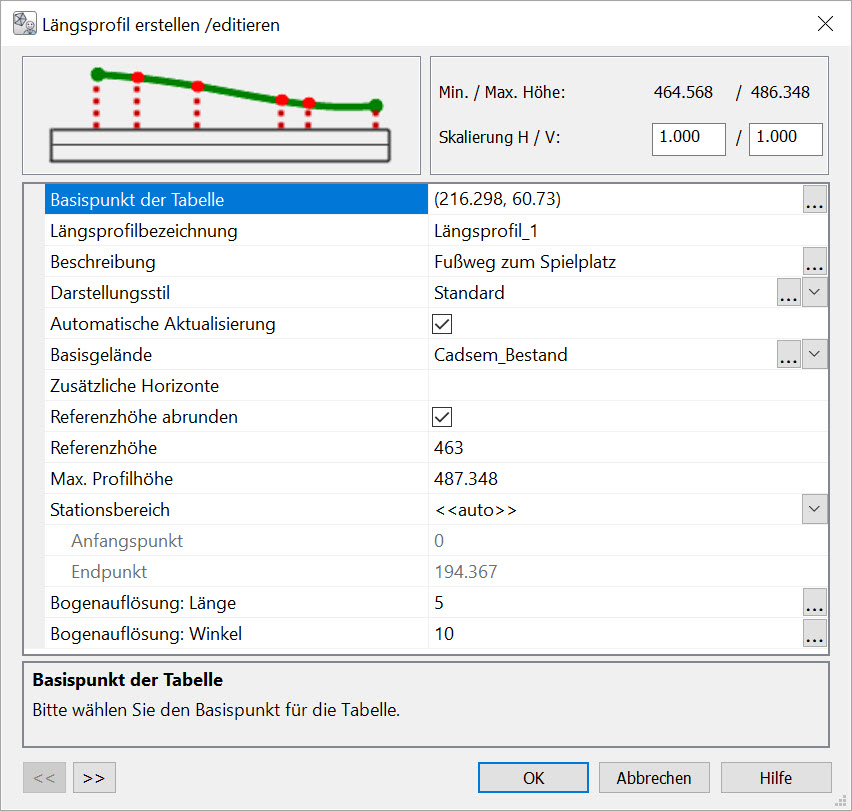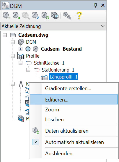 Das Editieren eines Längsprofils erfolgt über den gleichen Dialog wie beim Erstellen eines Längsprofils. Die Editierfunktion wird über das Kontextmenü am gewählten Längsprofil im Projektbrowser zur Verfügung gestellt. Es können alle Werte, die auch für die Erstellung eines Längsprofils zur Verfügung stehen, modifiziert werden.