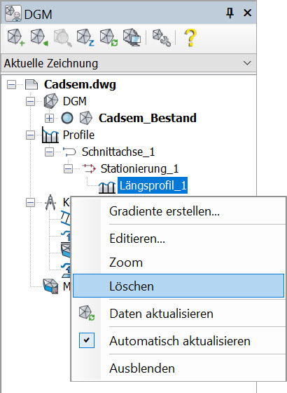 Das Löschen eines Längsprofils sollte immer durch Auswahl des betreffenden Elementes im Projektbrowser erfolgen. Die Funktion Löschen steht dabei nur im Kontextmenü zur Verfügung.