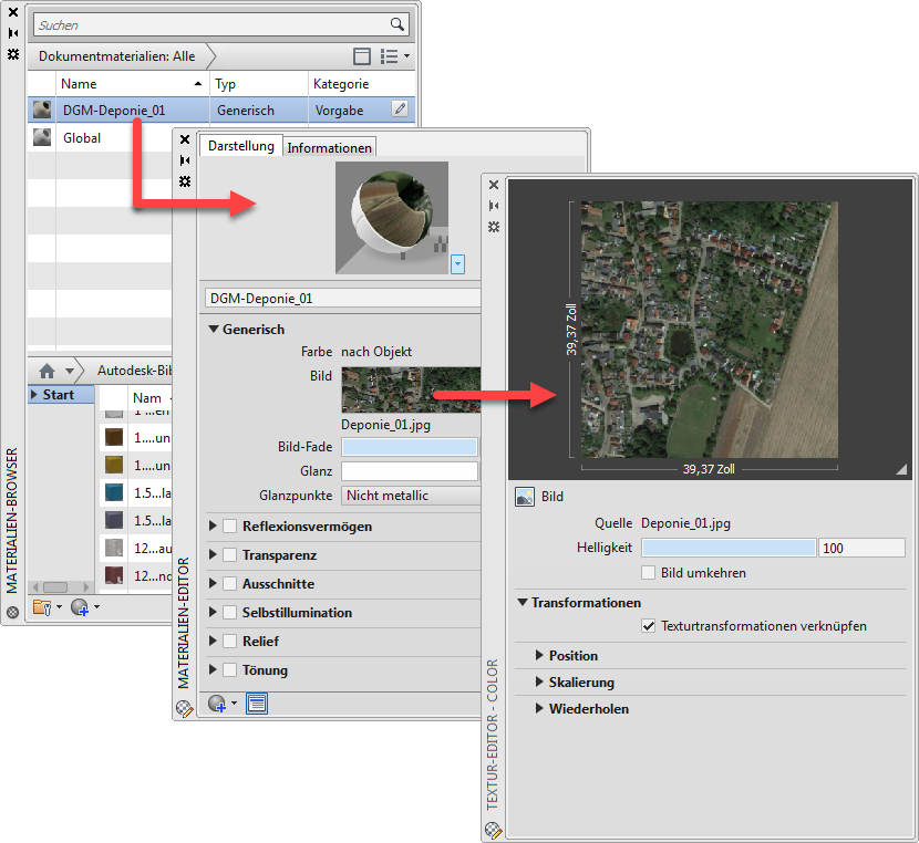 Durch die Bildprojektion wird ein Rendermaterial im Zeichnungsdokument automatisiert erzeugt und dem Ergebnis-Objekt zugeordnet.