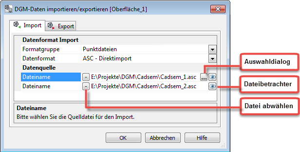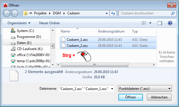Der Datenimport unterstützt die gleichzeitige Auswahl mehrerer Dateien des gleichen Datentyps. Davon ausgenommen sind lediglich REB-Dateien und Daten im Format LandXML. Außerdem ist es nicht möglich OPALS zu verwenden, wenn Sie mehrere Dateien gleichzeitig importieren möchten.