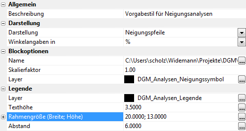Die Ergebnisse der Analyse können optional innerhalb einer Legende dargestellt werden. Für die Ausgabe der Legende stehen verschiedene Parameter für deren Konfiguration zur Verfügung. Die Legende wird dabei ebenfalls auf einem eigenen Layer innerhalb der Zeichnung erstellt. Für die Generierung des Layernamens gilt das gleiche Prinzip wie für die Erstellung des Darstellungslayers. Für die Texte der Legende können der Textstil, die Texthöhe sowie der Abstand von der Grafik der Legende festgelegt werden.