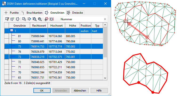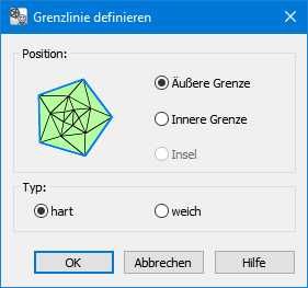 Hierbei erfolgt das Ein- bzw. Ausblenden von Dreiecken und bei weichen Grenzlinien i. d. R. die Generierung neuer DGM-Punkte sowie die Triangulation an die Grenzlinie.