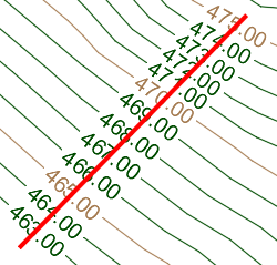 Die Zaunlinie wird hierbei in der Zeichnung als dicke rote Linie dargestellt. Nach der Bestätigung mit OK oder Anwenden erfolgt die Beschriftung gemäß den Einstellungen im aktuell zugewiesenen Beschriftungsstil. Jede beschriftete Isolinie wird automatisch am Beschriftungspunkt im Bereich des Textwertes unterbrochen dargestellt.