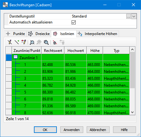 Sie können nun in gewohnter Weise zeichnen und den Befehl mit Enter abschließen. Hierbei werden alle Schnittpunkte der Zaunlinie mit Angabe der Koordinaten und des Isolinien-Typs in den Beschriftungsdialog übernommen.