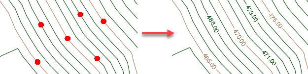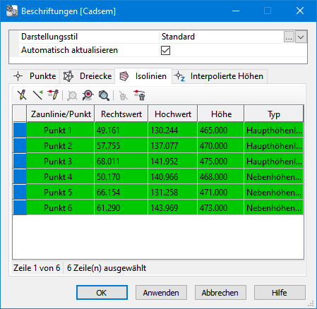 Diese Funktion ermöglicht die gezielte manuelle Beschriftung von Isolinien. Dazu werden Sie aufgefordert, die betreffenden Isolinien an der Stelle ihrer Beschriftung zu selektieren. Alle gültigen Selektionen werden hierbei durch einen dicken roten Punkt in der Zeichnung markiert. Nach der Beendigung der Auswahl mit Enter werden alle Punkte mit Angabe der Koordinaten und des Isolinien-Typs in den Beschriftungsdialog übernommen. Nach der Bestätigung mit OK oder Anwenden erfolgt die Beschriftung gemäß den Einstellungen im aktuell zugewiesenen Beschriftungsstil. Jede beschriftete Isolinie wird automatisch am Beschriftungspunkt im Bereich des Textwertes unterbrochen dargestellt. |