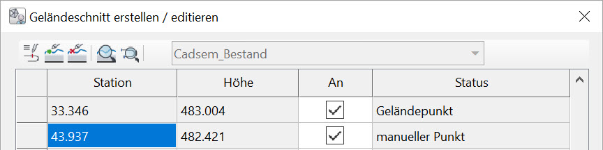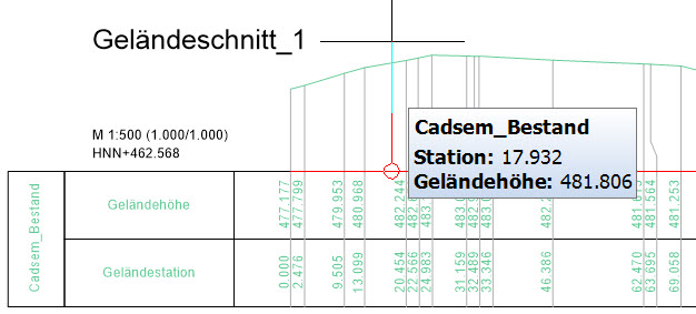 Mit dieser Funktion wird ein manueller Beschriftungspunkt im Geländeschnitt ausgewählt. Das Dialogfeld wird dabei temporär geschlossen. Von der aktuellen Position des Cursors in der Zeichnung wird eine temporäre Stationslinie lotrecht auf den Schnitt angezeigt. Der Tooltipp verfügt hierbei über die Werte für die Station und die Geländehöhe sowie die Bezeichnung der aktuell gewählten Oberfläche. Durch betätigen der Eingabetaste gelangen Sie zurück in den Dialog für den Geländeschnitt. Der Stationswert und die Höhe werden hierbei als "manueller Punkt" im Dialog eingetragen. Gleichzeitig wird die entsprechende Station am Geländeschnitt eingezeichnet. |