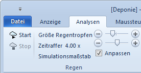 Für die aktuelle Oberfläche kann die Simulation eines Niederschlagsereignisses ausgeführt werden. Die Simulation wird durch die Schaltfläche Start berechnet und ausgeführt. Beendet wird die Simulation mit der Schaltfläche Stop. |