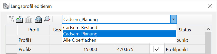 Wenn dem Längsprofil mehrere Oberflächen zugewiesen wurden, dann können Sie die betreffende Oberfläche aus der Liste wählen. Für die jeweils ausgewählte Oberfläche werden dabei die zugehörigen Beschriftungspunkte im Dialogfeld für die Bearbeitung angezeigt.