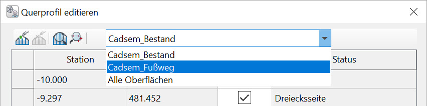 Wenn dem Querprofil mehrere Oberflächen zugewiesen wurden, dann können Sie die betreffende Oberfläche aus der Liste wählen. Für die jeweils ausgewählte Oberfläche werden dabei die zugehörigen Beschriftungspunkte im Dialogfeld für die Bearbeitung angezeigt.