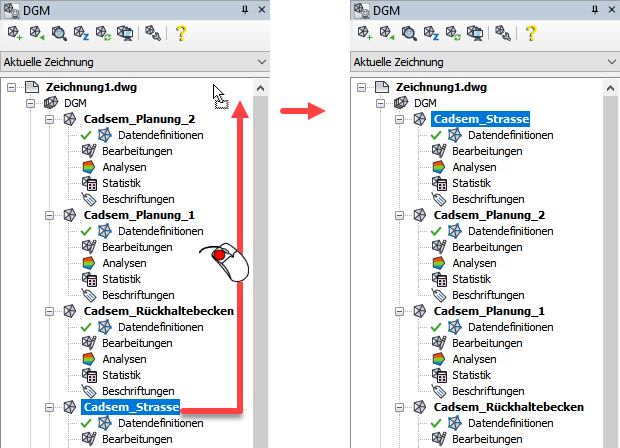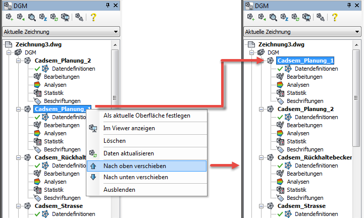 Hinweis: Oberflächen werden bei Mehrfachauswahl in der gleichen Reihenfolge auch an den DGM-Viewer übergeben. Dieser besitzt ebenfalls eine Möglichkeit, die Reihenfolge zu verschieben, so dass diese dann unabhängig von der Darstellung im Projektbrowser ist. |