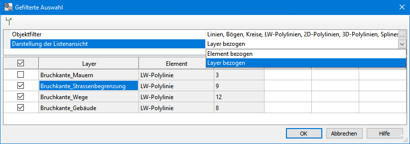 Alle ausgewählten Elemente werden in einer Listenansicht im Dialogfeld dargestellt. Die Darstellung der Listenansicht kann Layer bezogen oder Element bezogen erfolgen. In der Darstellung Layer bezogen werden alle Elemente gemäß deren Layer-Zuordnung dargestellt. Es werden zusätzlich der Layername, der Typ des Elements, der Elementname sowie die Anzahl der betreffenden Elemente aufgelistet.