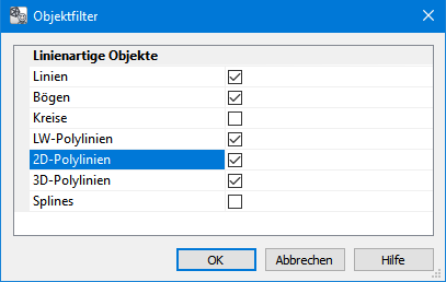 Mit dem Objektfilter lassen sich die Objekttypen spezifizieren. Die Objektwahl berücksichtigt daher stets nur diejenigen Objekte, die im Filter aktiviert sind. Linienartige Objekte – Diese Objekte verfügen mindestens über zwei Stützpunkte und können darüber hinaus Bögen enthalten. |