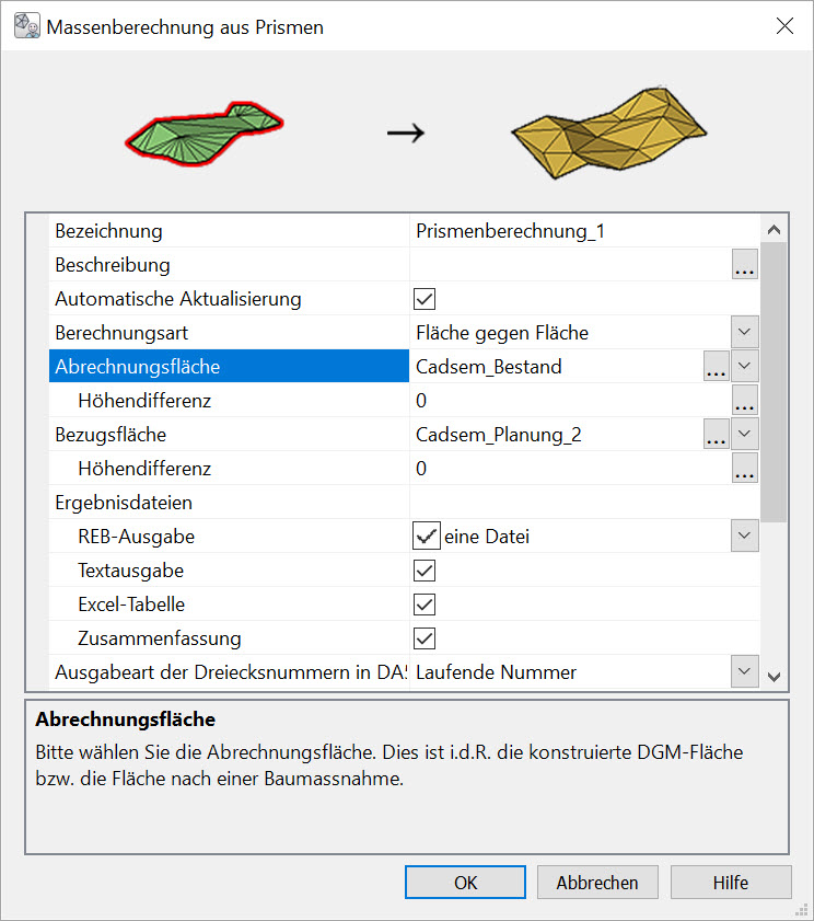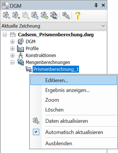 Jede Prismenberechnung lässt sich nachträglich editieren. Das Editieren erfolgt über den gleichen Dialog wie beim Erstellen einer Prismenberechnung. Die Editierfunktion wird über das Kontextmenü am gewählten Menüeintrag im Projektbrowser zur Verfügung gestellt. Es können alle Werte, die auch für die Erstellung einer Prismenberechnung zur Verfügung stehen, modifiziert werden.
