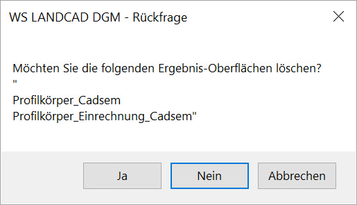 Wurden mit einem assoziierten Profilkörper automatisch weitere DGM-Flächen erstellt, erscheint zusätzlich eine weitere Rückfrage, ob diese ebenfalls gelöscht werden sollen. Ein Behalten der Flächen kann z. B. Sinn machen, wenn die Konstruktion nur einen Zwischenschritt darstellte und keine diesbezügliche Abhängigkeit mehr benötigt wird.