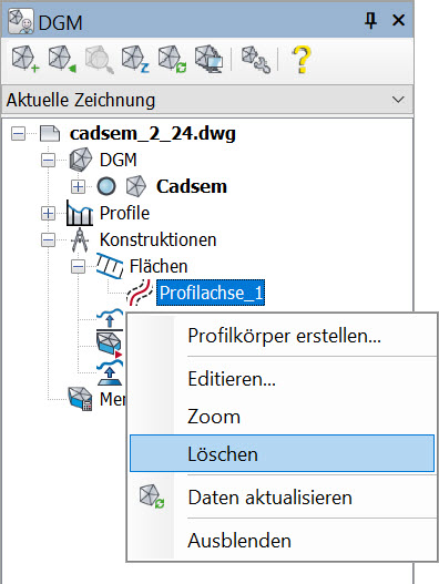 Hinweis: Zum Löschen einer Profilachse ist ausschließlich dieser Befehl zu verwenden. Ein Löschen mit dem CAD-Befehl Löschen würde nur die Zeichnungsreferenz entfernen, nicht aber die Daten im DGM. Der Eintrag im Projektbrowser verschwindet nicht und eine Aktualisierung generiert wieder die vermeintlich gelöschte Achse.