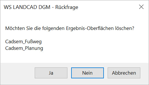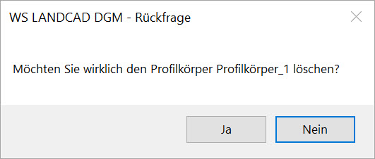 Wurden mit einem Profilkörper automatisch weitere DGM-Flächen erstellt, erscheint zusätzlich eine weitere Rückfrage, ob diese ebenfalls gelöscht werden sollen. Ein Behalten der Flächen kann z. B. Sinn machen, wenn der Profilkörper nur einen Zwischenschritt darstellte und keine diesbezügliche Abhängigkeit mehr benötigt wird.