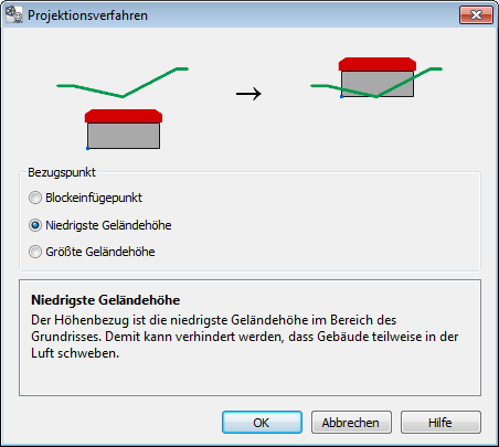 Dies ist das Standardverfahren, welches auch bei der Funktion Objekte projizieren verwendet wird und daher auch keine Wahl eines Bezugslayers benötigt. Der Höhenbezug ist stets der projizierte Blockeinfügepunkt. |